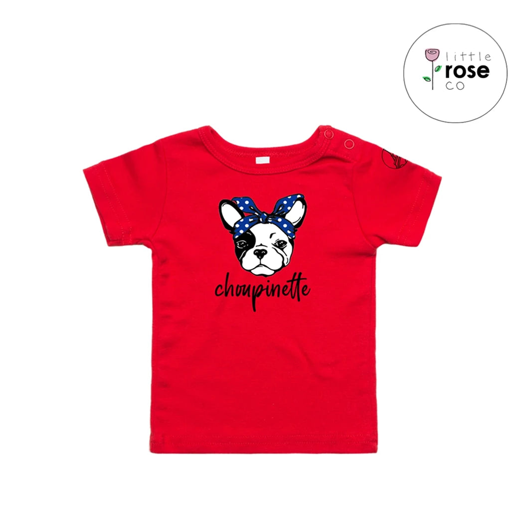 An adorable kids t-shirt featuring an image of a cute French Bulldog and the word choupinette, a cute name given to little girls in France like possum or munchkin in english.