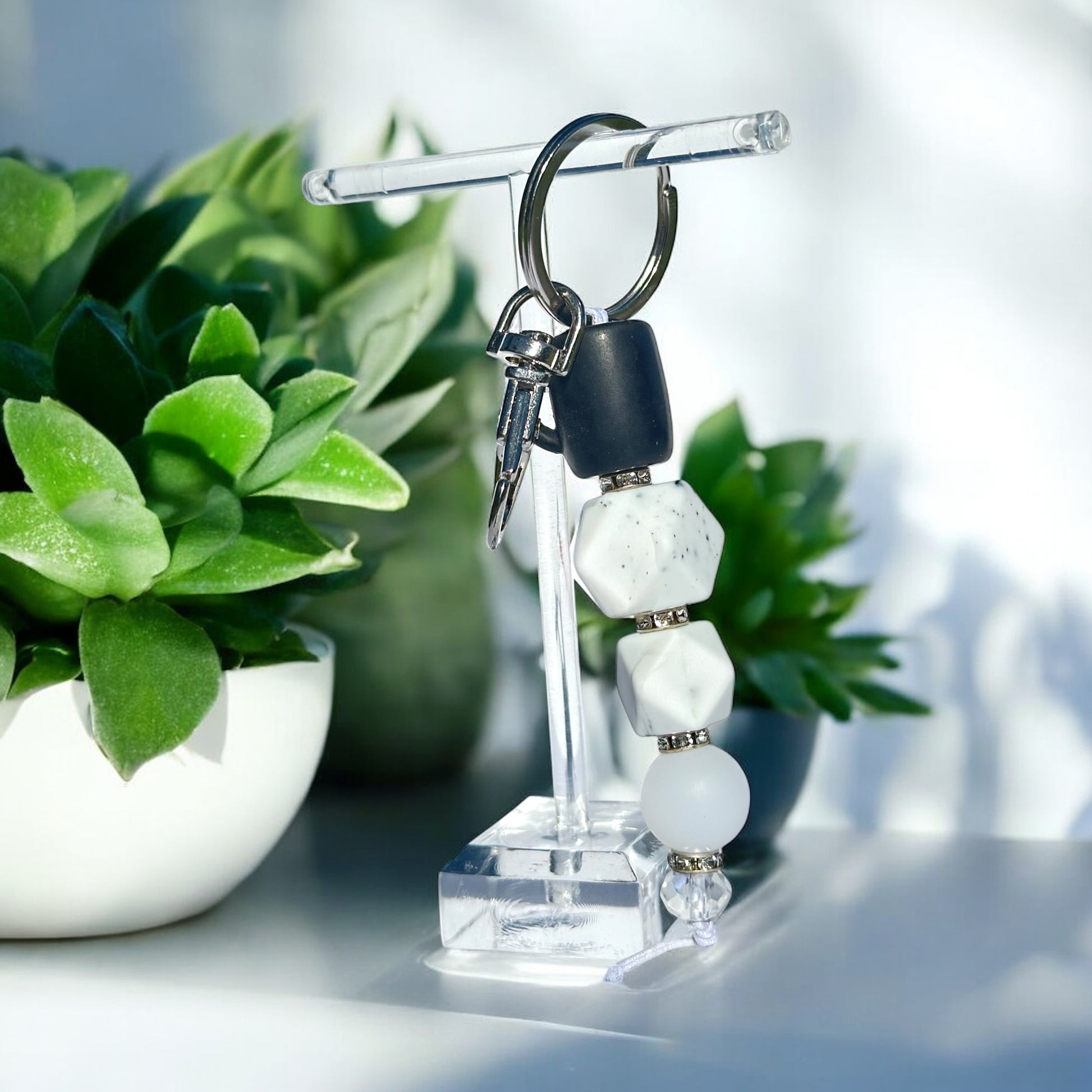 Gorgeous black and white coffee keychain, a perfect addition to your everyday essentials. Featuring white granite and marble beads, complemented by a black coffee mug. A lovely accessory in a chic design for your keys or bag.